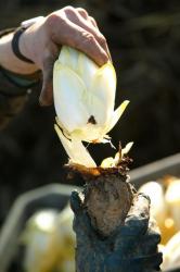 | La chicorée est cultivée en plein champ. Les racines, qui vont servir à donner l’endive, sont récoltées en septembre-octobre. Traditionnellement, les racines sont placées dans une fosse rectangulaire creusée dans la terre (une « couche »). Celle-ci sera recouverte d’une tôle, de paille et de bâches pour former un petit tunnel, afin que les conditions de chaleur, d’obscurité et d’humidité soient réunies. Le forçage commence alors. Quelques semaines plus tard, les endives sont cassées à la main une par une pour être séparée de sa racine. Puis elles sont soigneusement épluchées manuellement, triées et conditionnées. | ![]() |