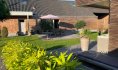 Terrasse avec espace détente couvert : spa (sans supplément), douche, coin détente avec cheminée,transats..., jardin clos de 250m² sans vis à vis.