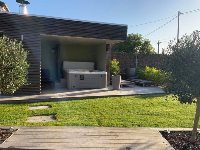 Terrasse avec espace détente couvert : spa (sans supplément), douche, coin détente avec cheminée,transats..., jardin clos de 250m² sans vis à vis.
